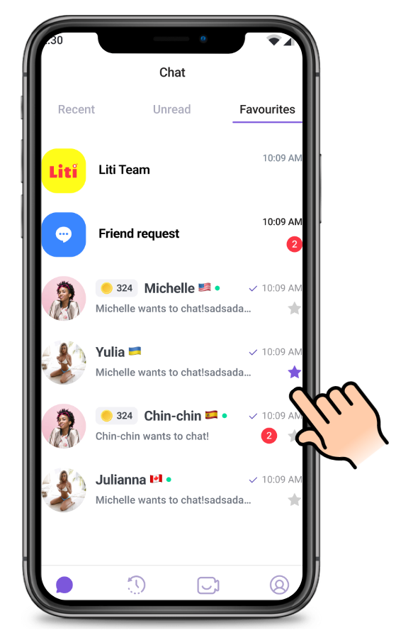 Вкладку "Favourites" ти можеш знайти у повідомленнях. Ця функція допоможе тобі не загубити своїх улюблених користувачів і завжди бути на зв'язку з тими, хто для тебе важливий.